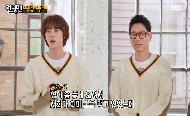이에 진은 "형님까지 저쪽으로 가면 나 너무 서운할 뻔했다"고 넉살 좋게 말했고, 생각지도 못한 월드스타의 등장에 김종국은 환호했다.