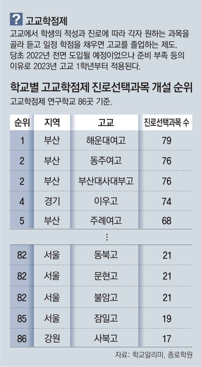 6일 동아일보 취재진이 종로학원과 함께 학교알리미에 공시된 고교학점제 연구학교 86곳의 진로 선택과목을 전수 분석한 결과 평균 개설 과목은 37.1개였다. 그런데 학교별 격차가 매우 컸다. 가장 많은 과목을 만든 곳은 79개(부산 해운대여고), 가장 적은 곳은 17개(강원 사북고)로 나타났다. 개설 과목 수 차이가 4배 이상으로 벌어진 것이다.