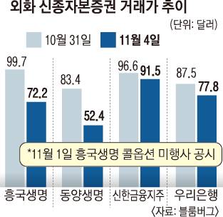 6일 블룸버그에 따르면 외화채권시장에서 흥국생명의 액면가 100달러 신종자본증권(영구채) 거래 가격은 지난 4일 72.2달러로 급락했다. 흥국생명이 콜옵션 포기 의사를 공시하기 하루 전인 10월 31일 99.7달러에 거래됐던 것에 비하면 가격이 30% 가까이 떨어진 것이다. 예정대로 이달 상환을 예상하고 시장에서는 100달러 가까운 가격에 거래됐으나 이번 사태로 상환 시기가 최대 30년으로 늘어나면서 가격이 떨어진 것이다. 그동안 한국물 신종자본증권은 콜옵션 행사가 불문율처럼 이뤄져 왔다.