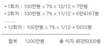 은행적금은 연 7%, 예금은 연 4%, 기간은 1년간 똑 같은 금액으로 거래할 때 어떤 것이 유리할까요? 1년 정기예금에 1200만원을 연 4%로 신규하면 만기시 48만원을 받습니다. 은행적금에 100만원씩 12번 불입해 연 7%로 12백만원을 불입하는 경우는, 첫번째 100만원 이자 계산과 12번째 이자 계산식이 다음과 같이 달라집니다.