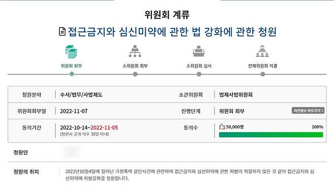해당 청원은 오는 11월 13일까지 진행될 예정이었지만, 지난 5일 국회 국민 동의 청원 성립 요건인 5만 명을 달성해 조기 마감되면서 오늘(7일) 법제사법위원회 회부된 것으로 파악됐습니다.