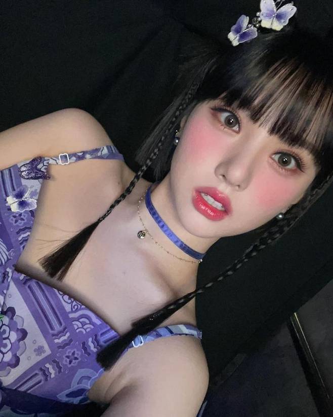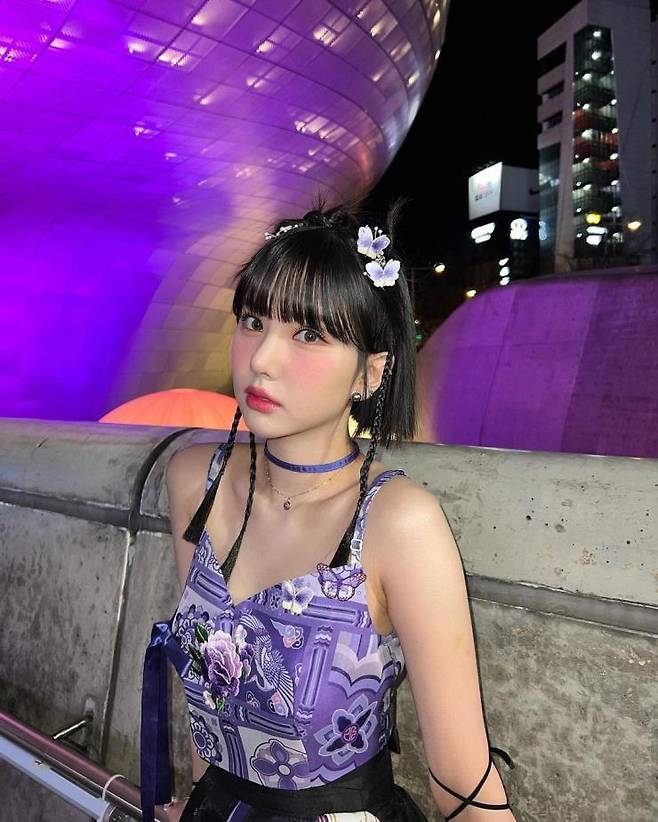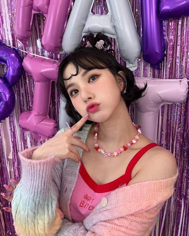 S컬펌 베이스에 앞머리 두 가닥을 말아 하트 모양의 앞머리를 완성한 비비지 은하. 여기에 하트 장식 헤어 끈을 이용해 양 갈래 머리까지 완성하니 그야말로 귀여움 한도 초과! 혹은 살짝 웨이브를 넣은 머리에 대왕 리본 헤어핀을 꽂아보는 것도 좋은 방법.