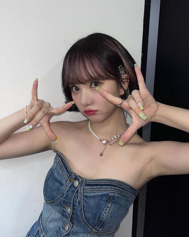 풀뱅 앞머리와 단발에 흑발까지 더해지면 자칫 답답해 보일 수도 있는 건 어쩔 수 없는 사실! 답답함을 탈출할 수 있는 돌파구를 찾고 있다면, 은하의 염색을 참고해보자. 흑발 사이사이에 핑크색 하이라이트를 넣어 발레아쥬 염색을 완성해 화사함 한층 업업! 발레아쥬 염색을 위한 탈색이 부담스럽다면 헤어피스를 이용해보자. 빗자루 모발 걱정 없이 원하는 컬러를 자유자재로 시도하기 딱 좋으니~.