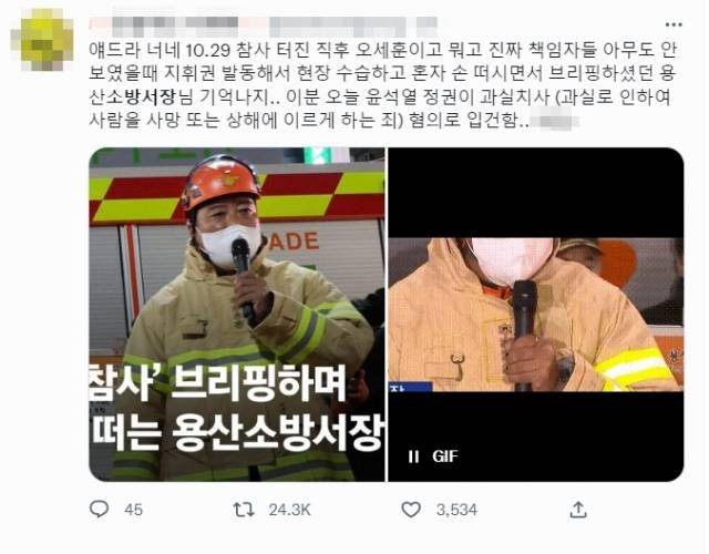 이 같은 소식이 전해지자 누리꾼들은 공분했다. 트위터 실시간 트렌드에는 ‘소방서장’이라는 키워드가 오르내렸고 온라인 커뮤니티와 SNS에는 관련 소식이 빠르게 퍼지며 “납득할 수 없는 상황”이라는 비난이 쏟아졌다. 많은 이들은 참사 당시 브리핑을 하던 최 서장의 모습을 떠올리며 “표창을 줘도 모자랄 판에 피의자 신분으로 입건됐다는 것은 말이 안 된다” “놀다 늦은 것도 아니고 머리 출혈 환자를 이송하다 늦은 건데 과실치사라니 황당하다” “전형적인 꼬리 자르기다” “최 서장에게 뒤집어씌우기 하는 거냐” 등의 비판이 이어졌다.