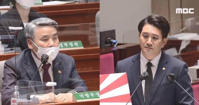 전 의원은 이날 이종섭 국방부 장관을 상대로 ‘욱일기 경례’ 논란에 대해 강도 높게 비판했다. 전날 한국 해군은 해상자위대 창설 70주년 기념 국제관함식에서 욱일기와 같은 자위함기가 내걸린 호위함 ‘이즈모’에 거수경례를 해 논란이 일고 있다.