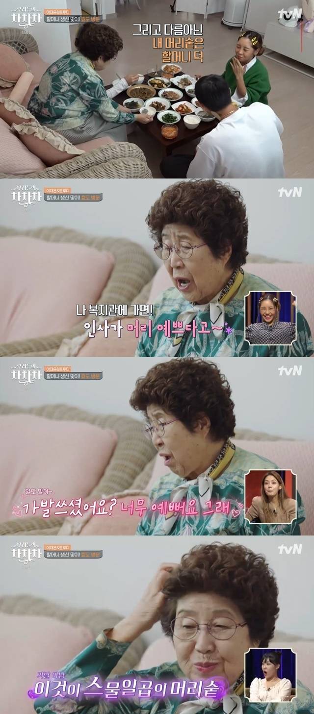 트루디와 할머니의 말대로 트루디 할머니는 88세 나이에도 불구하고 건강하고 풍성한 머리카락을 자랑해 감탄을 자아냈다. 트루디는 “머리만 보면 27살이다”고 할머니를 칭찬했다. (사진=tvN ‘우리들의 차차차’ 캡처)