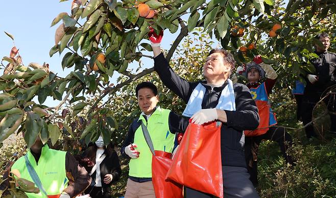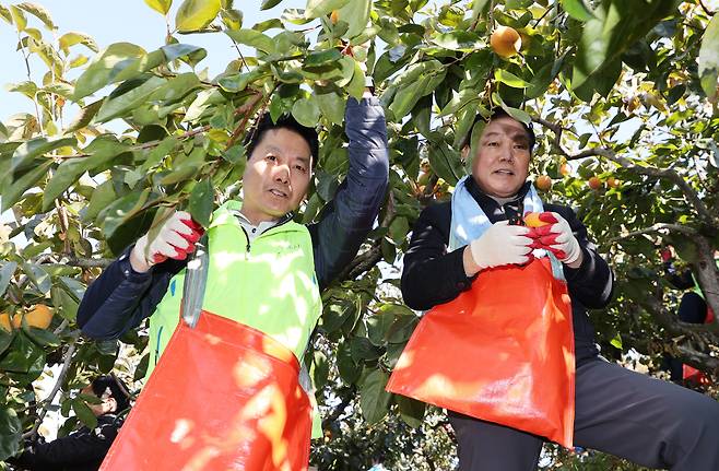 경남도는 가을 수확 시기에 농촌일손돕기에 적극 나선다. 박완수 도지사를 비롯한 공무원들은 8일 김해 진영에서 단감 수확을 도왔다.