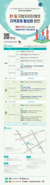 이번 세미나는 ‘한·일 지방자치단체의 지역경제 활성화 방안’을 주제로 한·일 양국이 경험하고 있고, 합리적인 정책 방안 마련을 위해 앞으로도 지속적으로 논의해야 할 지역경제 활성화 방안에 대해 공통적인 고민과 혜안을 나누는 담론의 장을 마련하고자 한다.