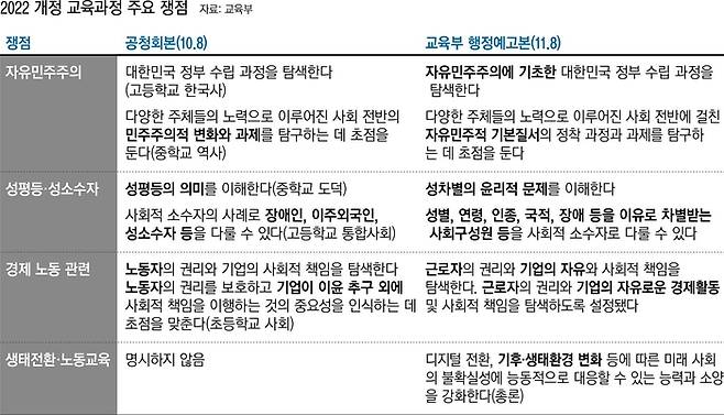 교육과정 시안이 공개됐을 때부터 거센 논란이 일었던 역사과·사회과 교육과정의 일부 기술이 행정예고안에서 대폭 수정됐다. 역사과 교육과정 성취기준과 해설의 ‘민주주의’ 용어 중 일부가 ‘자유민주주의’와 ‘자유민주적 기본질서’로 변경됐다.