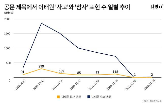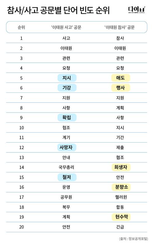 경향신문 데이터저널리즘팀 다이브가 정보공개포털에서 지난달 29일부터 지난 6일까지 중앙행정기관과 광역자치단체가 생산한 이태원 참사 관련 공문 7111건의 수집해 제목을 분석한 결과, ‘사고’라고 쓴 공문(이하 사고 공문)에서 가장 자주 등장한 표현은 ‘지시’(1193회)였고 ‘참사’라고 표현한 공문(이하 참사 공문)에서 가장 빈번하게 쓰인 단어는 ‘애도’(148회)였다. 검색 키워드는 ‘이태원 참사’ ‘이태원 사고’였으며 이태원, 관련, 요청 등 공통적으로 등장한 단어는 제외한 결과다. 수집은 지난 7일 오전 실시했으며 이후 추가 공개된 공문들이 있어 세부 수치는 현재 상황과 다를 수 있다.