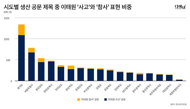 참사 문건의 비중이 가장 높은 곳은 경상북도(24.7%)였다. 경북 울릉군과 예천군, 김천시 등에서는 사고라고 쓴 공문보다 참사라 쓴 공문이 더 많았다. 전북 장수군, 충북 음성군도 사고보다 참사라 쓴 공문을 더 많이 생산한 지자체에 속했다. 대구 서구에서 생산한 ‘이태원 대참사 관련 업무협의 간담회 개최’ 공문에서는 ‘대참사’라는 표현도 등장했다.