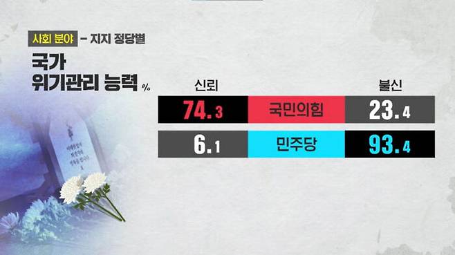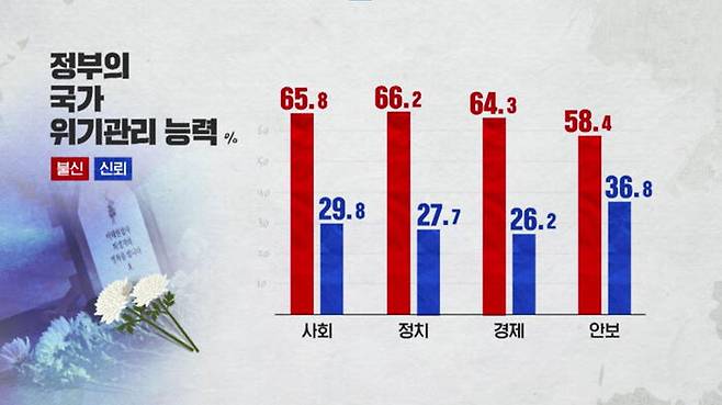 정부의 위기관리 능력에 대한 신뢰가 대통령 국정 지지도와 엇비슷하다는 점은 국정 운영 기조 전반에 대한 점검과 쇄신이 필요하다는 신호로도 읽힙니다.