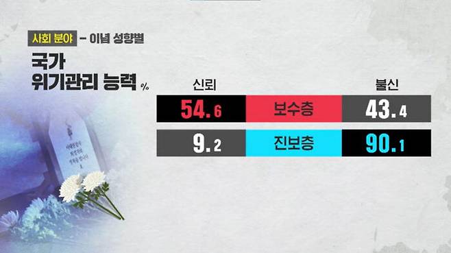 보수 층에선 신뢰 54.6%, 불신 43.4%였지만 진보 층에선 신뢰 9.2%, 불신 90.1% 였습니다.