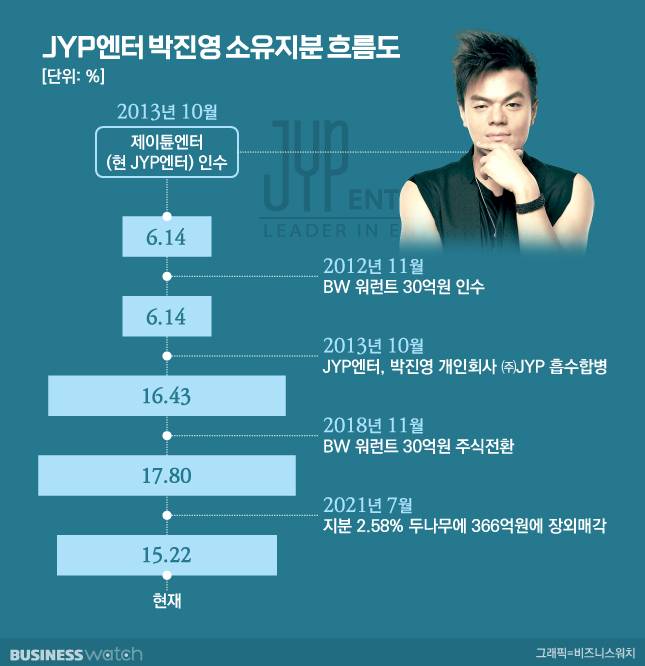 실제 박 이사는 JYP엔터 인수 이후 BW 발행 당시 JYP엔터 지분 5.82%를 직접 보유했다. 또한 JYP엔터 최대주주(10.35%)로 있던 개인회사 ㈜JYP(2013년 10월 JYP엔터에 흡수합병) 지분 44.17%를 가지고 있었다.