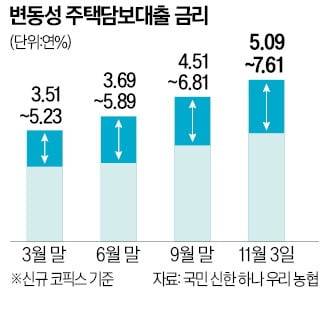 KB국민, 신한, 하나, 우리 등 4대 시중은행의 주택담보대출 변동 금리는 연 5.160~7.646%로 이미 하단이 5%를 넘겼고 상단은 7% 중반에 진입했다. 1년 전 4억원을 연 4%, 30년 만기로 빌렸다면 매달 원리금 상환액이 191만원에 그쳤지만 7.6%에서는 282만원으로 훌쩍 늘어난다.