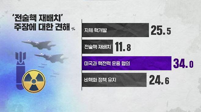 미국과 핵전력 운용을 협의하는 수준으로 동맹을 강화해야 한다는 의견이 34%로 가장 많았고, '자체 핵 개발' 25.5, '비핵화 정책 유지' 24.6%였습니다.