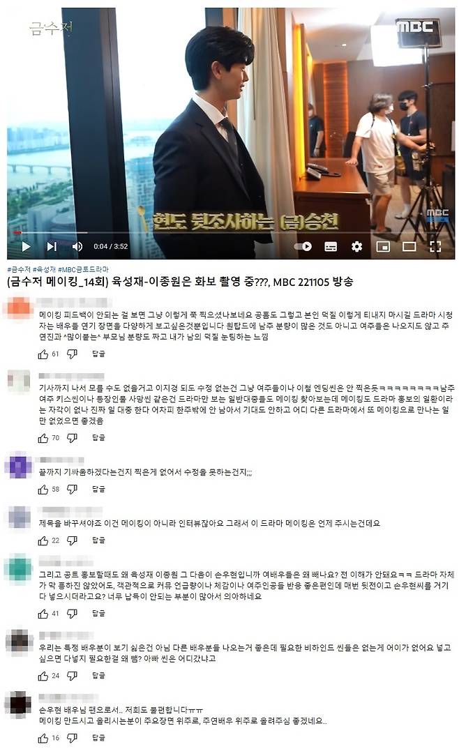 이에 누리꾼들은 해당 영상에 "내가 남의 덕질 눈팅하는 느낌이다" "여주들이나 이철 엔딩신은 안 찍었나" "끝까지 기싸움하겠다는 거냐" "특정 배우분이 보기 싫은 게 아니다. 필요한 비하인드 신들이 없는 게 어이없다. 아빠 신은 어디 갔냐" 등 불만을 터뜨렸다.