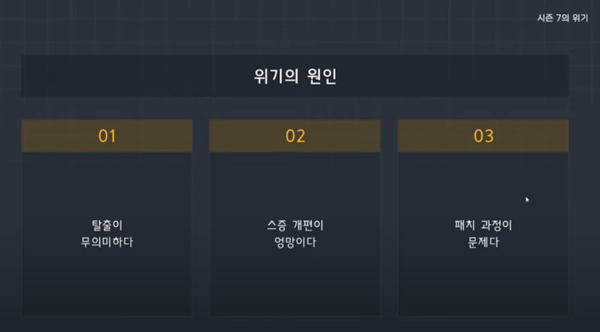 시즌7은 스킬 증폭 개편으로 인한 후속 패치로 많은 요소가 추가되지 못했습니다. 시즌8의 전장 같은 새로운 요소를 하루빨리 느껴보고 싶다는 생각을 계속 가지고 있었어요. 시즌6이 종료된 후 이후 개발 예정을 알려주는 간담회를 보고 시즌7보다 시즌8이 재밌어 보인다고 생각한 순간부터 시즌7은 건너뛰고 싶은 생각이 들 정도였어요.