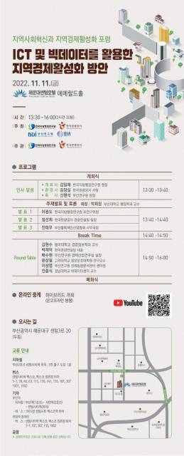 이번 포럼은 ‘ICT 및 빅데이터를 활용한 지역경제활성화 방안’을 주제로 급격한 인구 감소와 코로나19에 따른 지역경제 위기 극복 및 지역경제활성화를 위한 과학적이고 실천적 대안 제시할 예정이다.