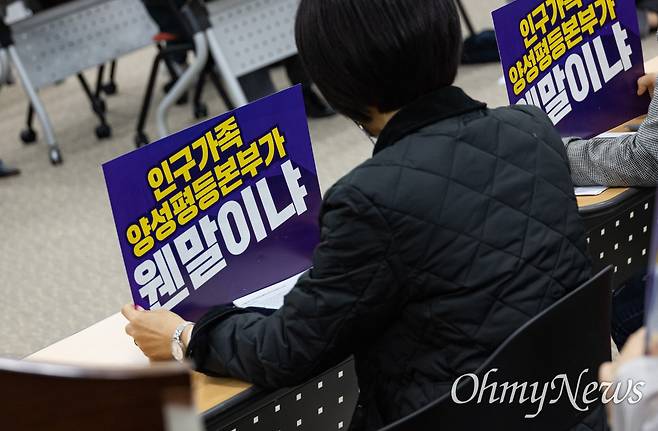 | ▲ 시민사회가 여성가족부 폐지 저지 국회 촉구를 진행하는 가운데, 이 같은 요구에 응답한 의원은 11일 현재 0명인 상태다. |