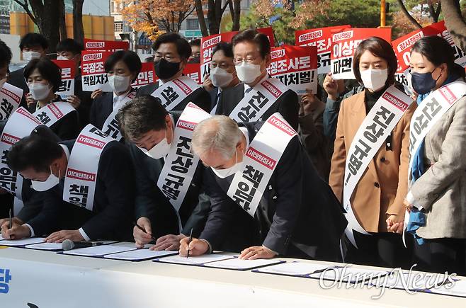 민주당은 11일 오후 서울 영등포구 여의도역 5번 출구 앞에서 '이태원 참사 국정조사·특검 추진 범국민 서명운동 발대식'을 열고, 서명운동을 시작했다. 오는 12일(토) 오후 3시부터는 용산역에서 서울시당 차원의 '서명운동 발대식'이 열리고, 이어 모든 시·도에서 서명운동이 이뤄질 예정이다. 민주당은 전국을 순회하는 '서명운동 홍보버스' 운영도 검토 중이다.