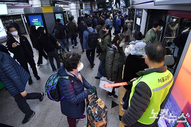 무궁화호 열차 탈선 여파로 출근길 서울 지하철 곳곳에서 열차가 지연 운행되는 등 차질이 빚어진 7일 오전 서울역 1호선 승강장이 승객들로 붐비고 있는 가운데 역 직원들이 시민들에게 안전 동선을 안내하고 있다. 한국철도공사(코레일)는 이날부터 출·퇴근 시간대 고객들이 안전하게 열차에 승·하차할 수 있도록 구로역·신도림역·금정역 등 40개 역에 질서지킴이 113명을 확대 배치한다. 류영주 기자