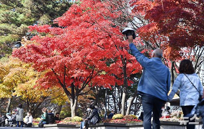 6일 서울 중구 N서울타워에서 시민들이 단풍길을 걷고 있다. 류영주 기자