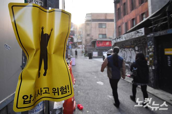 10일 오후 서울 마포구 홍익대 정문 인근 골목에 이제석광고연구소가 제작한 압사 사고 위험구간 표지판이 시범 부착돼 있다. 연구소는 좁은 골목 등에서 인파로 인한 압사사고의 위험성을 직관적으로 알리기 위해 표지판을 구겨 표현했다. 류영주 기자