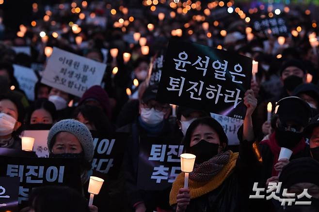 5일 오후 서울 중구 시청역 인근 도로에서 촛불행동 주최로 핼러윈 참사 희생자 추모 시민 촛불 집회가 열리고 있다.