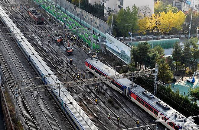 지난 6일 저녁 무궁화호 열차 탈선사고가 발생한 서울 영등포역 인근 철로에서 7일 오전 코레일 긴급 복구반원들이 복구작업을 벌이고 있다. 황진환 기자