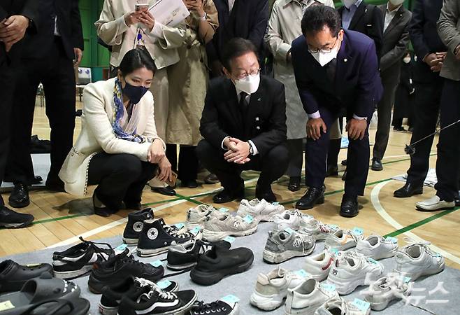 이재명 더불어민주당 대표가 8일 서울 용산구 원효로 다목적 실내체육관에 마련된 핼러윈 참사 유실물센터에 방문해 내부를 살펴보고 있다. 국회사진취재단