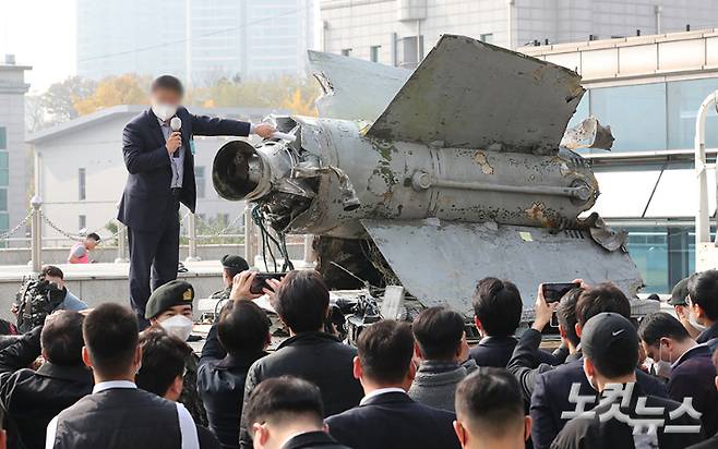 북한이 지난 2일 강원 원산에서 발사해 분단 후 처음으로 동해 북방한계선(NLL) 이남으로 떨어진 미사일 잔해가 9일 오전 서울 용산 국방부 청사에서 공개되고 있다. 류영주 기자