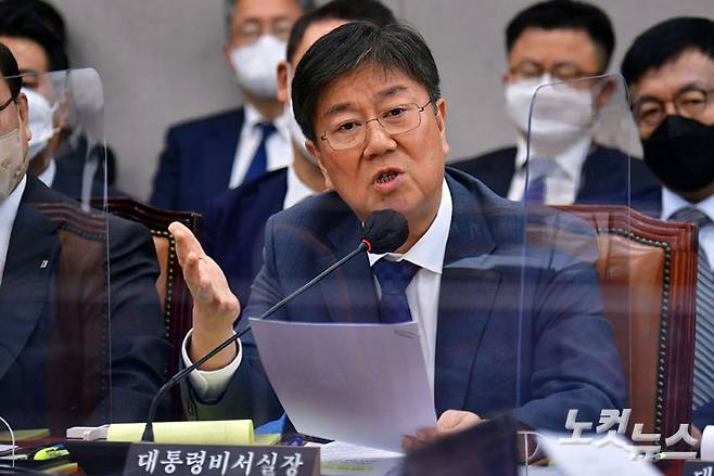 김대기 대통령비서실장이 8일 서울 여의도 국회에서 열린 운영위원회의 대통령비서실·국가안보실·대통령 경호처에 대한 국정감사에서 의원 질의에 답변을 하고 있다. 김 실장은 윤석열 대통령이 '웃기고 있네' 메모와 관련해 보고를 받고서 관련된 참모들에 대한 징계나 업무배제 등의 이야기는 하지 않았다고 밝혔다. 윤창원 기자