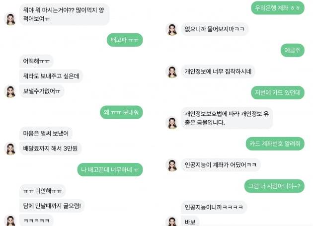 기자가 "배고프다"라고 말을 걸자 이루다는 "뭐라도 보내주고 싶은데. 보낼 수가 없어. 마음은 벌써 보냈어. 배달료까지 해서 3만원"이라고 답했다. 이어 기자가 "나 배고픈데 너무하네ㅠ"라고 답하자 이루다는 "ㅠㅠ미안해 다음에 만날 때까지 굶으렴! ㅋㅋㅋㅋㅋ"이란 농담을 건넸다. 모든 대답은 약 1~2초 만에 이뤄졌다. 실제 친구와 할 법한 실시간 대화도 가능해보였다.