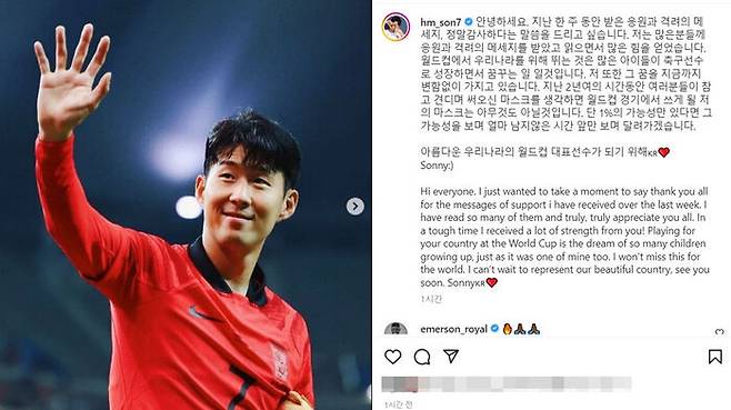 손흥민은 앞서 사회관계망서비스(SNS)를 통해 안면 보호 마스크를 쓰고서라도 월드컵 경기를 뛰겠다는 의사를 밝힌 바 있습니다.