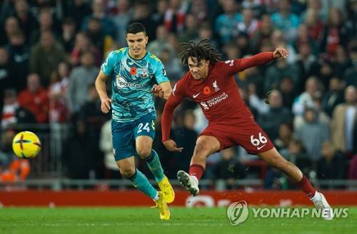 epa10302029 Southampton's Mohamed Elyounoussi (L) in action with Liverpool's Trent Alexander-Arnold (R) during the English Premier League soccer match between Liverpool and Southampton at Anfield in Liverpool, Britain, 12 November 2022. EPA/PETER POWELL EDITORIAL USE ONLY. No use with unauthorized audio, video, data, fixture lists, club/league logos or 'live' services. Online in-match use limited to 120 images, no video emulation. No use in betting, games or single club/league/player publications
