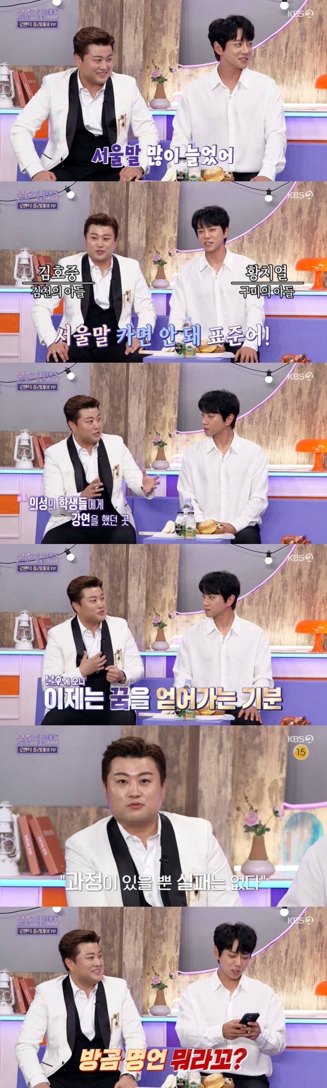김호중은 당시 자신의 이야기를 들었던 학생들을 떠올리며 “과정이 있을 뿐이지 실패는 없다고 한다. 끝까지 포기하지 않고 도전하다보면 활짝 웃을 수 있고, 어깨 쫙 피고 사는 날이 오지 않을까. 힘내라”고 응원했다. 김호중의 말에 감탄한 황치열은 휴대전화에 김호중의 말을 저장하려는 시늉을 해 웃음을 자아냈다.
