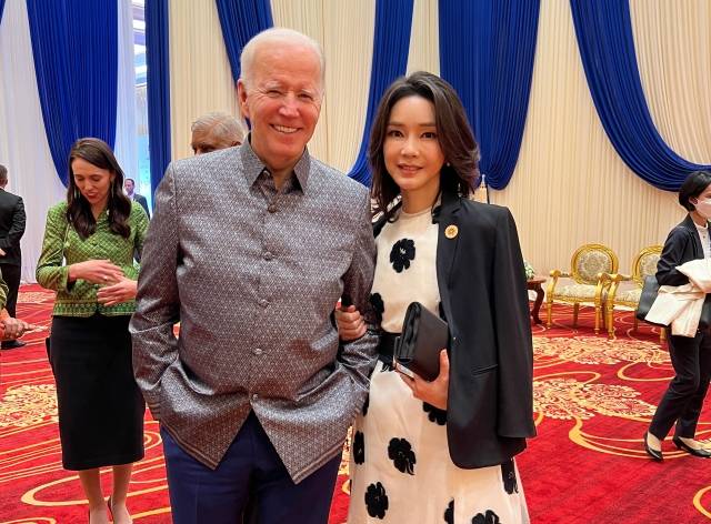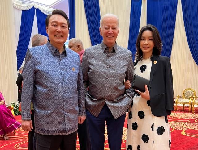 김건희 여사가 12일 오후(현지시간) 캄보디아 프놈펜 쯔노이짱바 국제 컨벤션센터에서 '아세안+3' 의장국인 캄보디아 정상 주최 갈라 만찬에 참석, 조 바이든 미국 대통령과 만나 팔장을 끼고 기념촬영을 하고 있다.