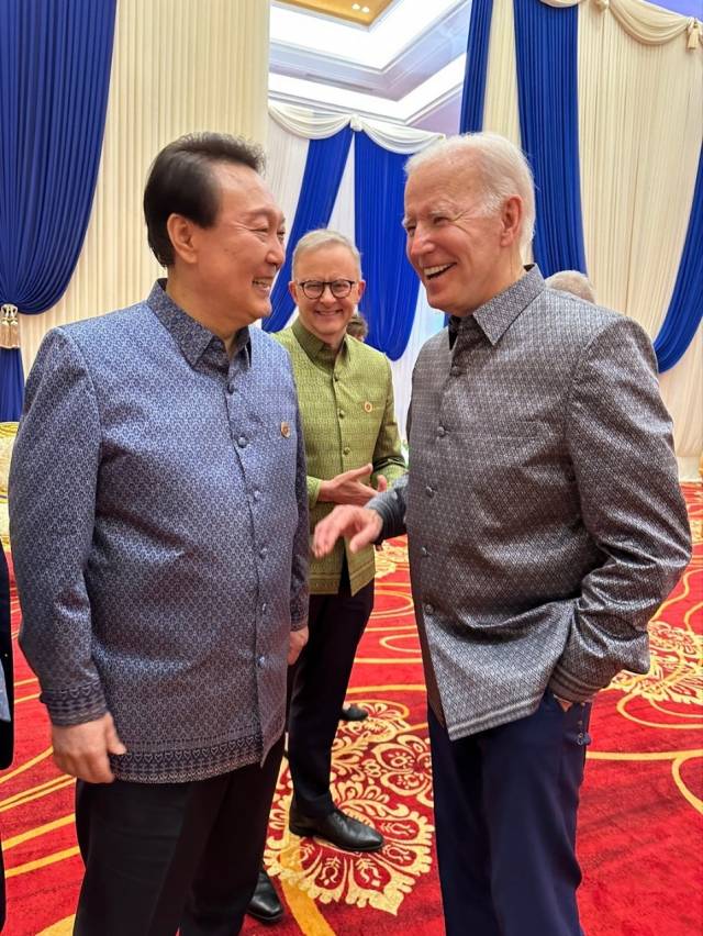 캄보디아 전통 의상 입고… 활짝 웃는 윤 대통령·바이든