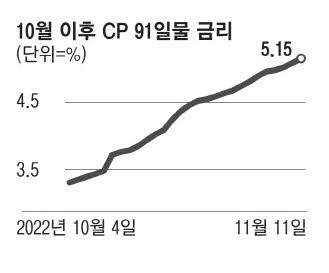 13일 금융투자협회에 따르면 지난 11일 우량기업 회사채인 신용등급 AA- 3년 만기 무보증 회사채 금리는 5.361%를 기록해 국고채 3년물(3.834%)과 벌어진 신용 스프레드가 152.7bp(1bp=0.01%포인트)로 2009년 5월 12일 152bp 이후 최대 폭을 보였다. 기업들의 단기자금 조달 금리를 대표하는 기업어음(CP) 금리는 지난 9일 5%를 돌파하면서 2009년 1월 이후 최고치를 나타냈다.