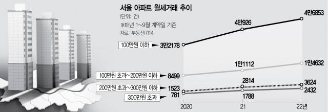 서울 내에서 월 300만원을 넘어서는 월세 거래가 2년 만에 3배 이상 증가한 것으로 나타났다. 금리가 계속해서 높아지면서 전세자금 대출이자에 대한 부담감을 느끼는 임차인들이 늘고, 여기에 집값 하락으로 시세차익보다 당장 받을 수 있는 월세를 선호하는 임대인들도 증가하며 나타난 현상으로 풀이된다.