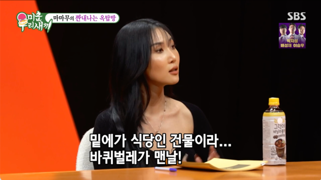 연습생 시절 옥탑방에서 합숙했다는 화사는 "전주에서 살았다. 서울의 옥탑방은 로망이었다. 밑에가 식당이면 바퀴벌레가 같이 산다. 솔라 언니 같은 경우는 불을 끄고 샤워를 했다"라고 말해 웃음을 자아냈다.