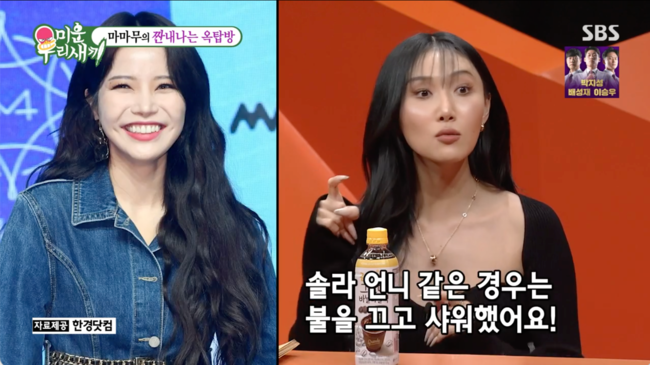 연습생 시절 옥탑방에서 합숙했다는 화사는 “전주에서 살았다. 서울의 옥탑방은 로망이었다. 밑에가 식당이면 바퀴벌레가 같이 산다. 솔라 언니 같은 경우는 불을 끄고 샤워를 했다”라고 말해 웃음을 자아냈다.