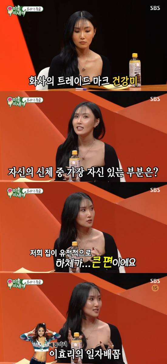 화사는 콤플렉스에 대해 "이건 콤플렉스라기보다 부끄러운 건데 배꼽이다. 요새는 배꼽을 잘 드러낸다. 이게 배꼽도 예뻐야 잘 드러낼 수 있다. 이효리 선배님도 배꼽 진짜 예쁘시지 않냐"라며 이효리를 언급했다.