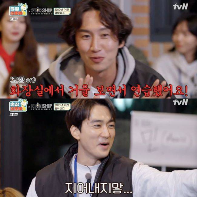 특히 송승헌이 “하나 둘 셋” 외치며 팀 구호를 팀원들과 자연스럽게 노래하는 모습을 보였다. 이에 이광수는 “와 승헌이 형 이제 자연스럽다”라며 놀라워했다. 이어 그는 “아까 잠깐 쉬는 시간에 화장실에서 승헌이 형이 구호 연습하는 걸 봤다”라고 모함해 웃음을 안겼다. 그러자 송승헌은 “야 지어내지마”라며 당황해 했다.