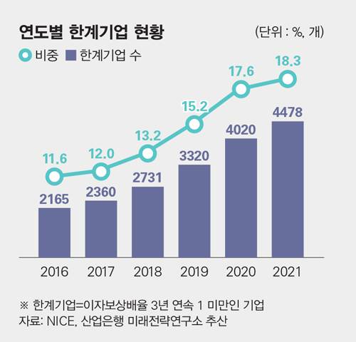 최근 금리 인상 기조와 자금시장 경색으로 이런 한계기업들이 부실 폭탄이 될 수 있다는 우려가 제기되고 있다. 지난 몇 달 동안 각종 경제연구소에서 한계기업들에 대한 보고서가 쏟아지는 것도 이와 무관치 않다. 산업은행 KDB 미래전략연구소의 '한계기업 현황과 시사점 보고서'(9월)와 전국경제인연합회 산하 한국경제연구원의 '기업 구조조정 제도 개선방안'(9월), 한국금융연구원의 '한계기업 증가 가능성과 향후 과제'(10월) 등이 그것이다.