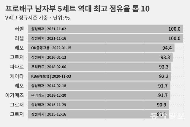 지난 시즌 삼성화재에서 뛰었던 러셀은 지난해 11월 2일과 16일 5세트 때 각각 공격 점유율 100%를 기록했습니다.