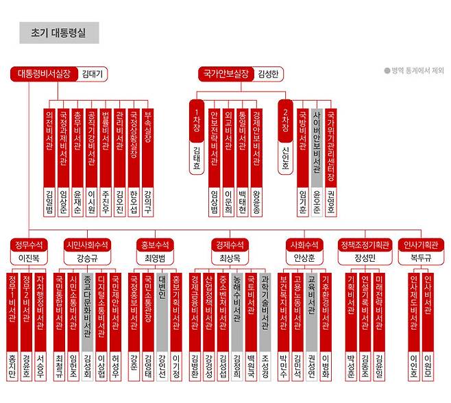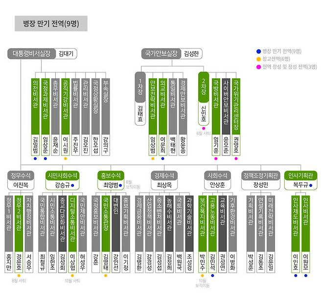 현역 장성 혹은 장성 출신은 3명(6.4%)입니다. 모두 관례적으로 군 출신들이 맡는 안보실 2차장 산하입니다. 신인호 2차장(8월 사퇴)은 육군 소장으로 전역했고, 임기훈 국방비서관과 권영호 국가위기관리센터장은 지금도 소장 계급 현역 군인입니다.