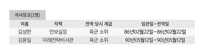 김성한 안보실장과 김윤일 미래전략비서관은 육군 소위로 전역했습니다. 이들 2명(4.2%) 서류상 복무 기간이 단 하루인, '석사장교' 제도로 군역을 이행했습니다. '특수전문요원'으로 불렸던 '석사장교' 제도는 석사 학위소지자에게 '지속적인 학문 기회를 부여한다'는 취지로 80년대 한시적으로 운영된 제도로, 6개월 간 군사 훈련을 받으면 소위 계급으로 임관과 동시에 당일 전역 시켜 줬습니다. 전두환·노태우 대통령 자녀에게 혜택을 주기 위해 만들어진 제도라는 당시 비판과 사회 고위층 자녀들의 군 회피 수단으로 악용된다는 지적에 1990년 4월 폐지됐습니다.