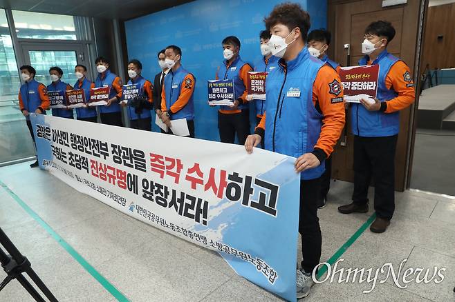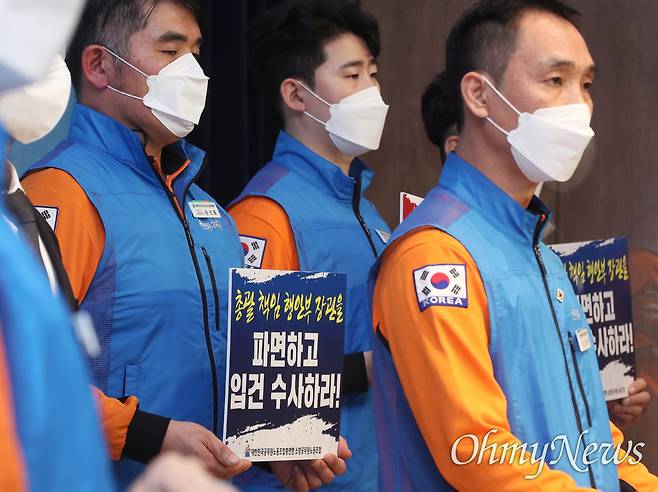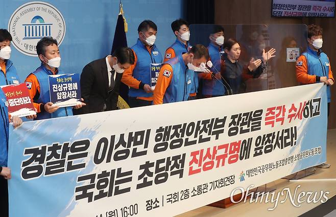 대한민국공무원노동종합총연맹 소방공무원노동조합(공노총 소방노조) 고진영 위원장을 비롯한 조합원들이 14일 오후 서울 여의도 국회 소통관에서 기자회견을 열고 "경찰은 이상민 행정안전부 장관을 즉각 수사하고 국회는 초당적 진상규명에 앞장서라"고 주장했다.